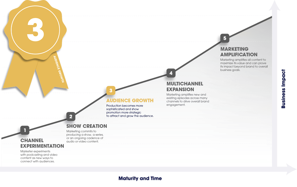 The hallmark of Stage 5 is clear, measurable business value. At this level, podcast and video content are central to a brand’s overall marketing strategy. Marketing amplifies all content to maximize its value and can prove its impact — beyond brand awareness — on overall business goals and revenue.